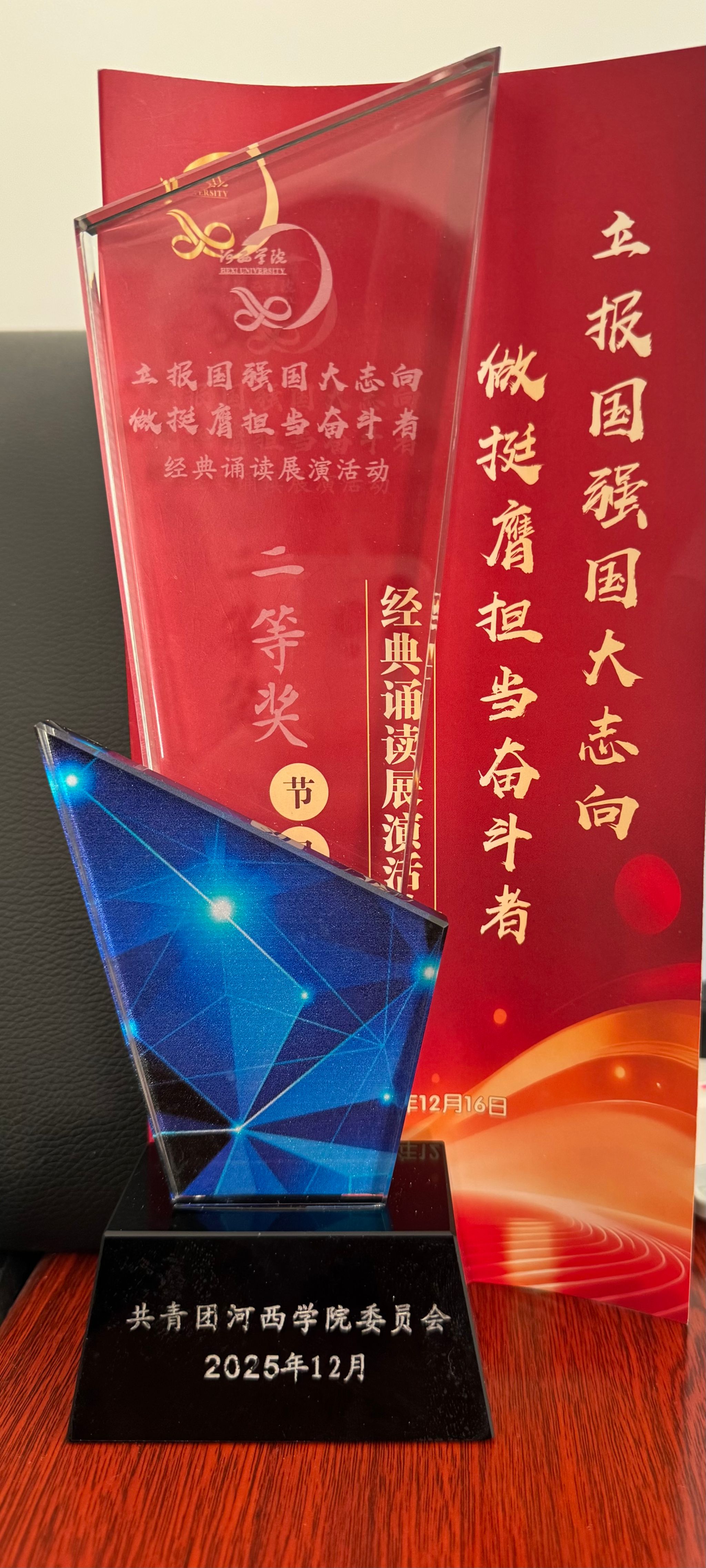 12月16日晚,河西学院“立报国强国大志向,做挺膺担当奋斗者”经典诵读展演活动在河西讲堂圆满落幕。我院选送的节目《青春》,凭借其深刻的主题立意、精湛的艺术呈现和昂扬的精神风貌,在众多优秀作品中脱颖而出,荣获二等奖。